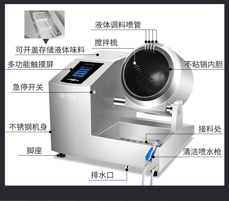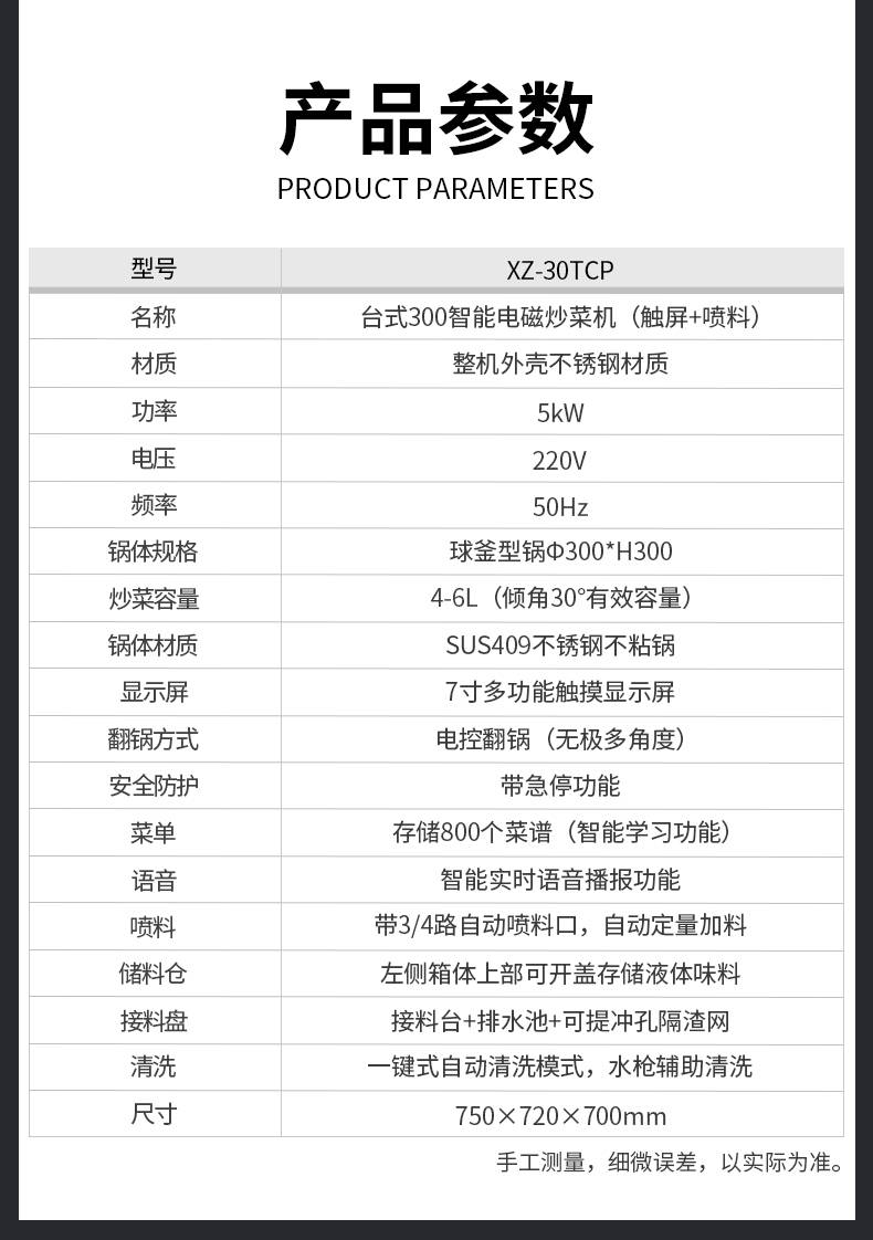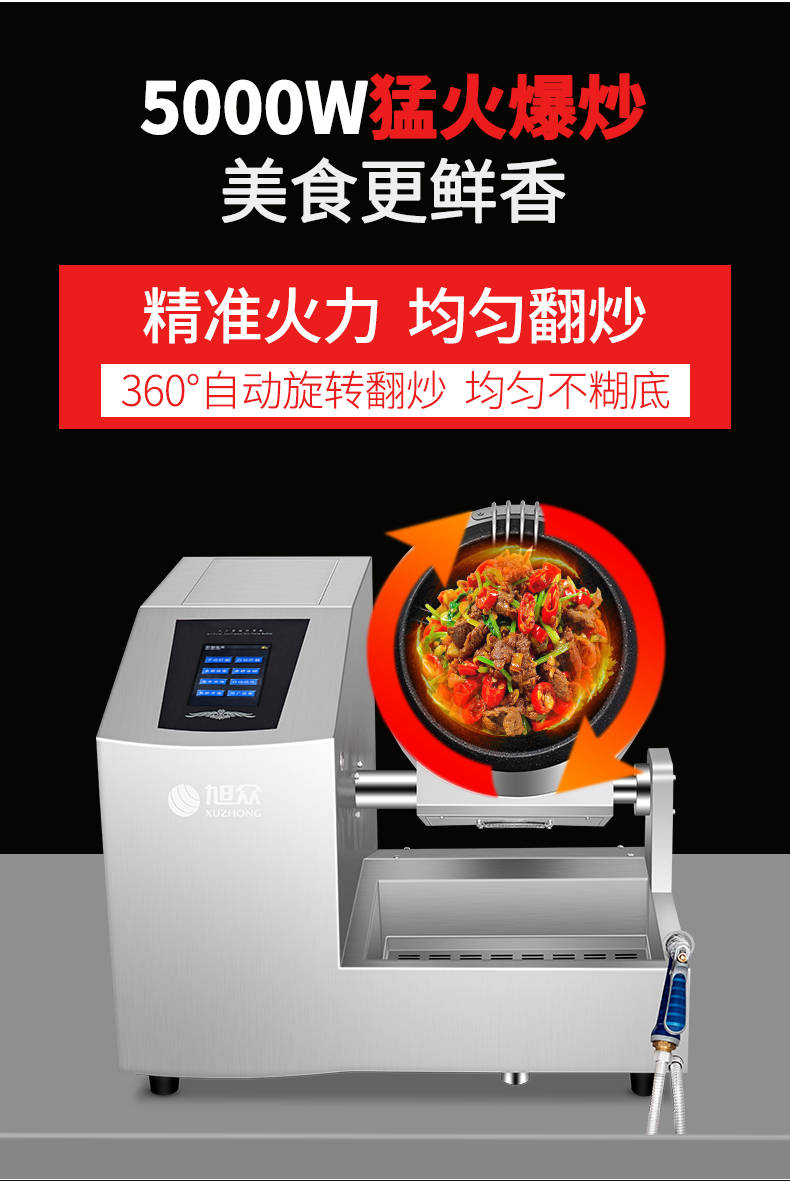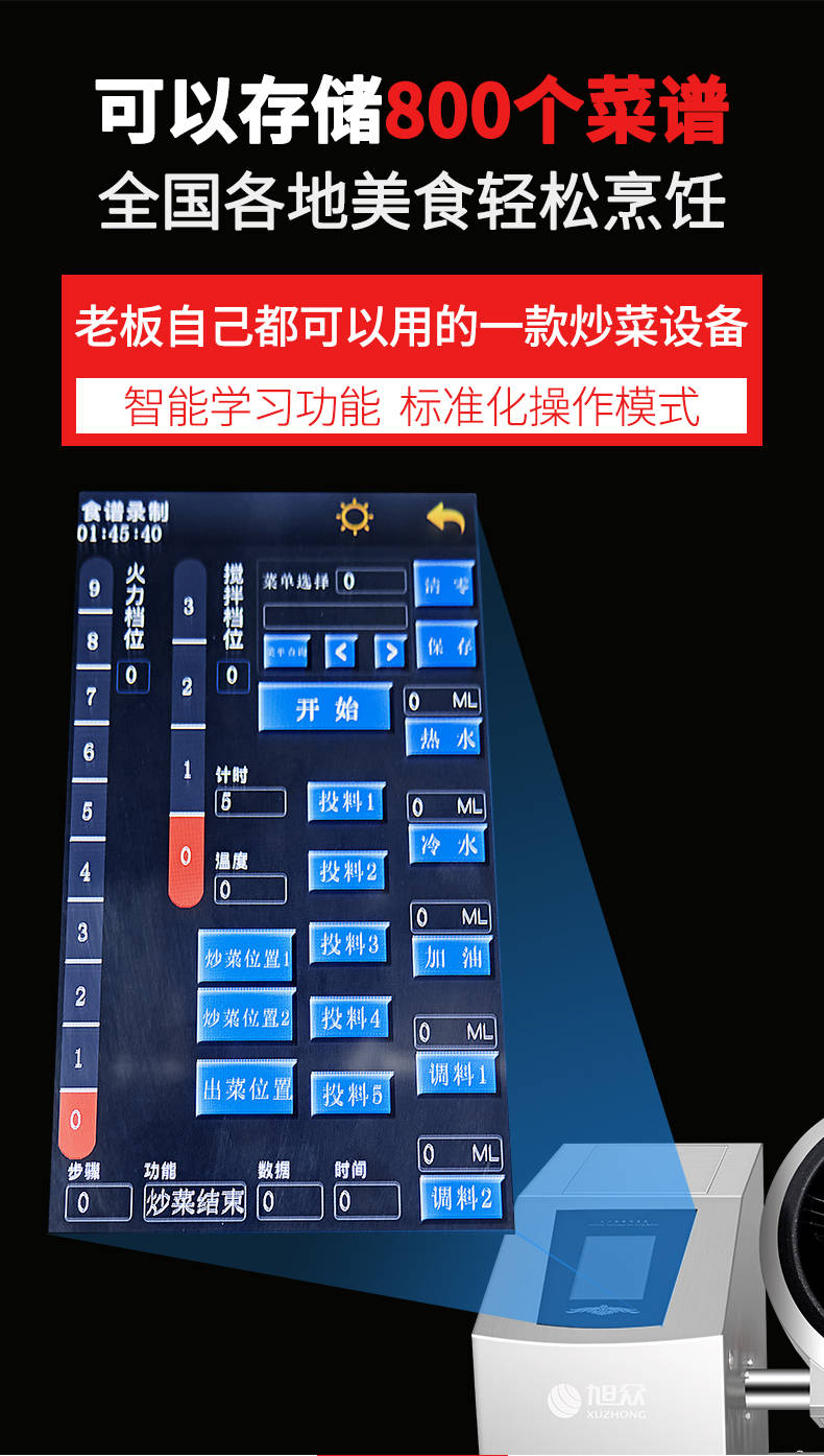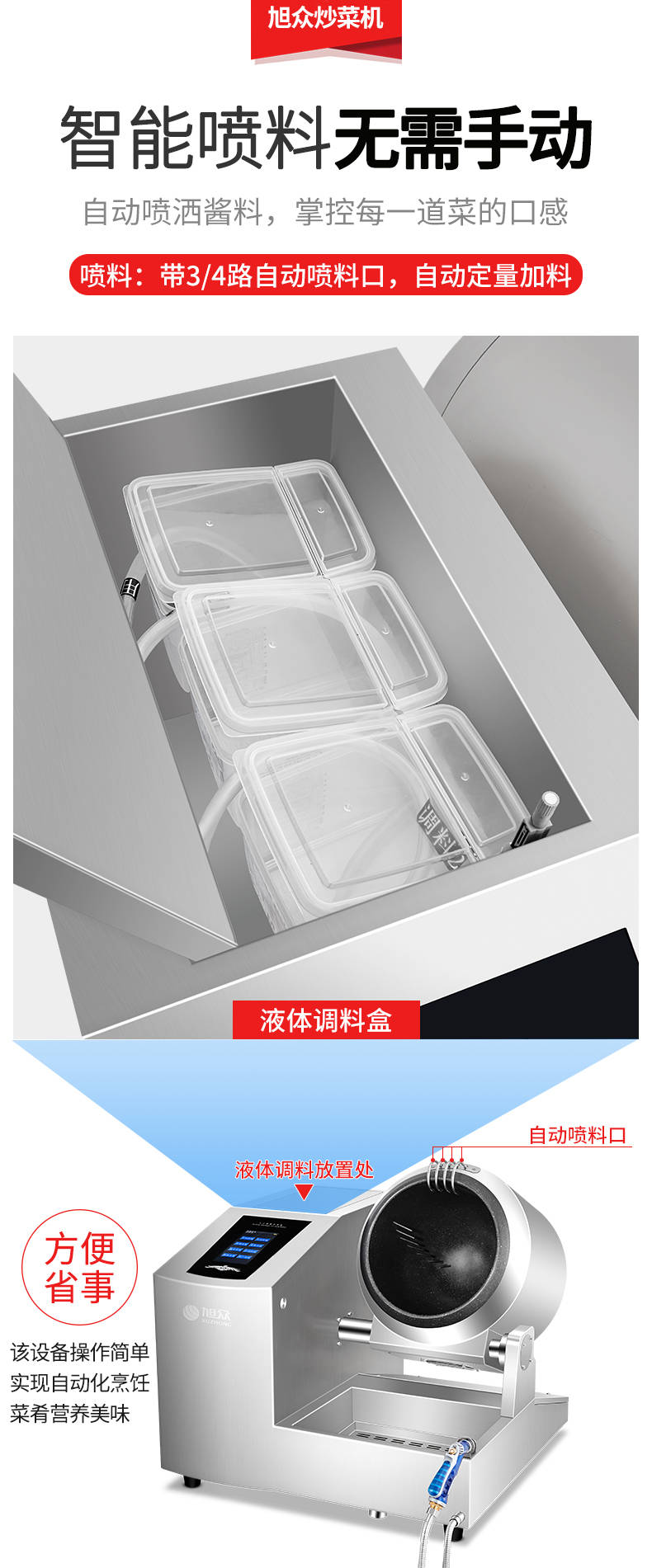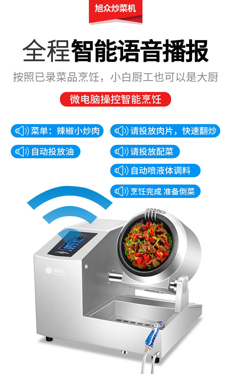 XZ-30TCP臺式300智能電磁炒菜機(jī)(觸屏+噴料),可以實(shí)現(xiàn)自動化烹飪過程的智能化設(shè)備,語音播報(bào)、自動噴料、旋轉(zhuǎn)翻炒、快速出菜。實(shí)現(xiàn)自動化烹飪,新一代微電腦操控智能烹飪設(shè)備、顛覆傳統(tǒng)炒菜模式。5000W猛火爆炒美食更鮮香