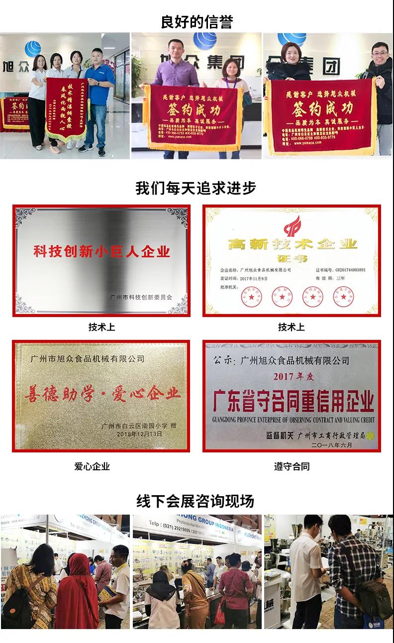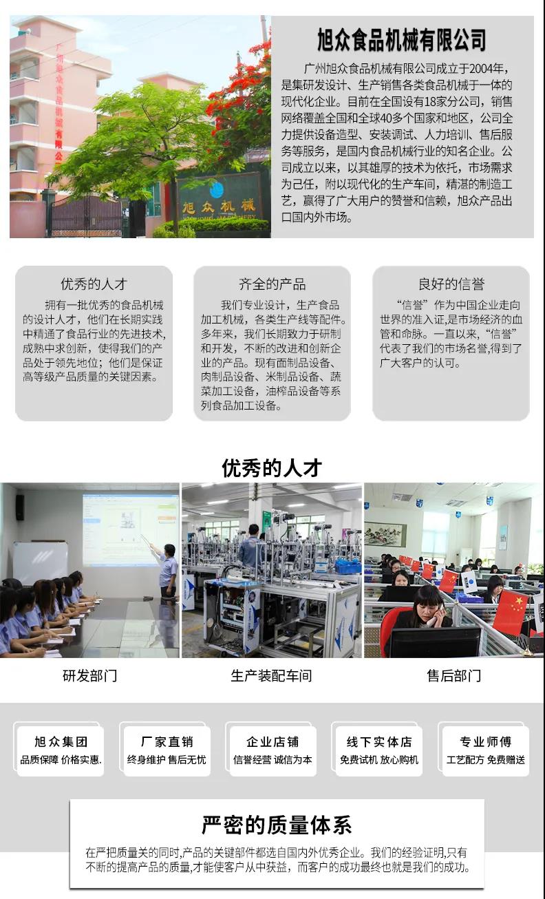 廣州旭眾食品機(jī)械有限公司是一家集科研開發(fā),生產(chǎn)設(shè)計(jì),營銷服務(wù)為一體的現(xiàn)代化生產(chǎn)企業(yè)?,F(xiàn)代化生產(chǎn)車間,精湛制造技術(shù),所產(chǎn)機(jī)械歷經(jīng)市場(chǎng)重重考驗(yàn),不斷贏得海內(nèi)外客戶的贊譽(yù)。