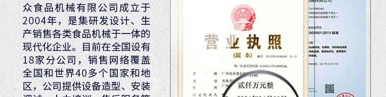 廣州旭眾食品機(jī)械有限公司是一家集科研開發(fā),生產(chǎn)設(shè)計(jì),營銷服務(wù)為一體的現(xiàn)代化生產(chǎn)企業(yè)?,F(xiàn)代化生產(chǎn)車間,精湛制造技術(shù),所產(chǎn)機(jī)械歷經(jīng)市場(chǎng)重重考驗(yàn),不斷贏得海內(nèi)外客戶的贊譽(yù)。