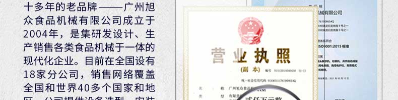 廣州旭眾食品機械有限公司是一家集科研開發(fā),生產(chǎn)設計,營銷服務為一體的現(xiàn)代化生產(chǎn)企業(yè)?,F(xiàn)代化生產(chǎn)車間,精湛制造技術,所產(chǎn)機械歷經(jīng)市場重重考驗,不斷贏得海內(nèi)外客戶的贊譽。