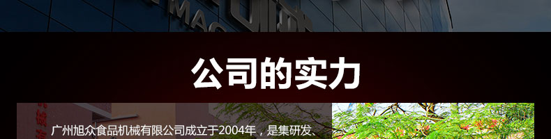 廣州旭眾食品機械有限公司是一家集科研開發(fā),生產(chǎn)設(shè)計,營銷服務為一體的現(xiàn)代化生產(chǎn)企業(yè)?,F(xiàn)代化生產(chǎn)車間,精湛制造技術(shù),所產(chǎn)機械歷經(jīng)市場重重考驗,不斷贏得海內(nèi)外客戶的贊譽。