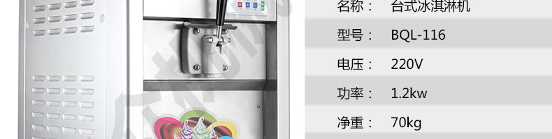 BQL-116臺(tái)式冰淇淋機(jī),●選用國(guó)際名牌成熟制冷配套件和高效壓縮機(jī),融合旭眾精湛工藝輔以嚴(yán)格的質(zhì)量控制流程,使產(chǎn)品整體性能及品質(zhì)得以全面提升?!癫捎萌珨?shù)字電腦控制系統(tǒng),選用名牌優(yōu)質(zhì)電器元件,先進(jìn)的生產(chǎn)工藝,故障診斷,軟硬任意調(diào)制,自動(dòng)修復(fù)功能,安全精確,可靠性更高?!駥I(yè)成熟制冷系統(tǒng)設(shè)計(jì),選用世界名牌大功率專用壓縮機(jī),大大縮短冰淇淋成型時(shí)間,相同時(shí)間內(nèi)冰淇淋產(chǎn)量大幅度增加,使您生意火爆時(shí)依然得心應(yīng)手,為您創(chuàng)造財(cái)富?!癜踩椒€(wěn)的機(jī)械攪拌系統(tǒng),噪音更低、振動(dòng)更小,使整機(jī)運(yùn)行性能達(dá)到國(guó)際先進(jìn)水平?!翊_保進(jìn)料溫度在0°C~35°C;環(huán)境溫度5°C~40°C勻可正常使用。