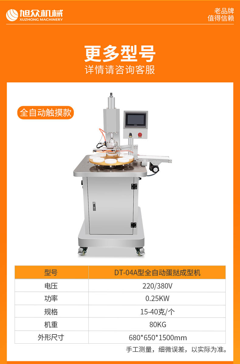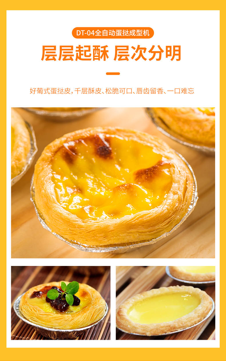 DT-04全自動蛋撻成型機,2-3秒快速成型。該機應(yīng)用于傳統(tǒng)蛋撻、葡式蛋撻及其它須印型之產(chǎn)品突破傳統(tǒng)用手捏,采用微電子控制成型,一個2-3秒,高效率。大小均勻一次成型按鍵操作簡單準(zhǔn)確,成型效果好,厚薄均勻,大小統(tǒng)-。層層起酥層次分明好葡式蛋撻皮,千層酥皮、松脆可口、唇齒留香、一口難忘。