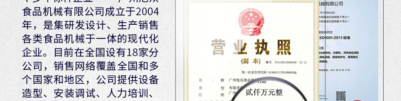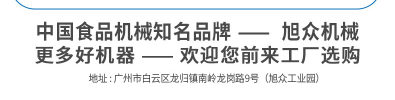 廣州旭眾食品機械有限公司是一家集科研開發(fā),生產(chǎn)設計,營銷服務為一體的現(xiàn)代化生產(chǎn)企業(yè)。現(xiàn)代化生產(chǎn)車間,精湛制造技術(shù),所產(chǎn)機械歷經(jīng)市場重重考驗,不斷贏得海內(nèi)外客戶的贊譽。