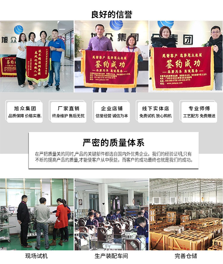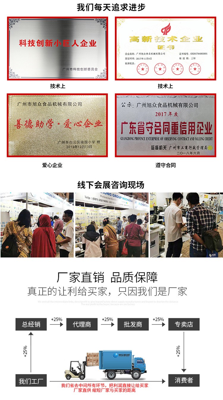 廣州旭眾食品機械有限公司是一家集科研開發(fā),生產(chǎn)設(shè)計,營銷服務為一體的現(xiàn)代化生產(chǎn)企業(yè)?,F(xiàn)代化生產(chǎn)車間,精湛制造技術(shù),所產(chǎn)機械歷經(jīng)市場重重考驗,不斷贏得海內(nèi)外客戶的贊譽。