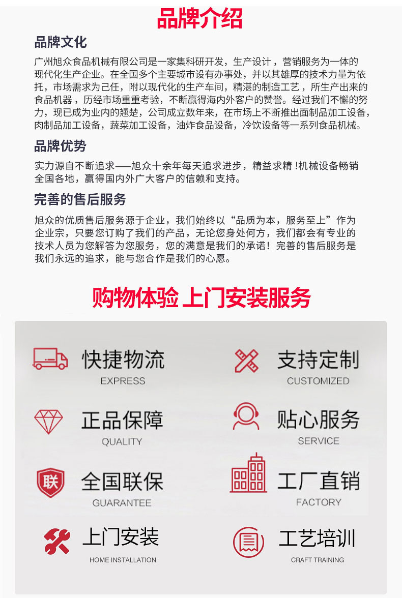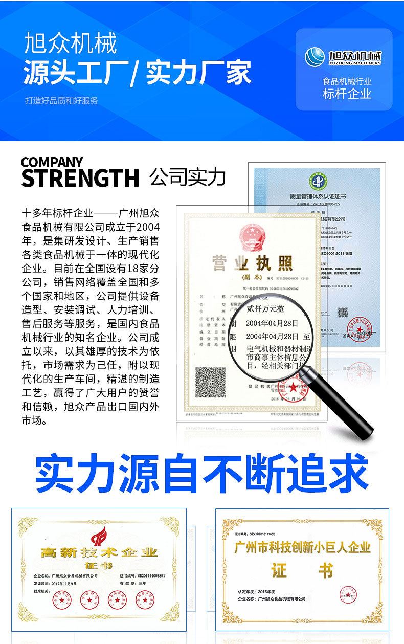 廣州旭眾食品機(jī)械有限公司是一家集科研開(kāi)發(fā),生產(chǎn)設(shè)計(jì),營(yíng)銷服務(wù)為一體的現(xiàn)代化生產(chǎn)企業(yè)。現(xiàn)代化生產(chǎn)車間,精湛制造技術(shù),所產(chǎn)機(jī)械歷經(jīng)市場(chǎng)重重考驗(yàn),不斷贏得海內(nèi)外客戶的贊譽(yù)。