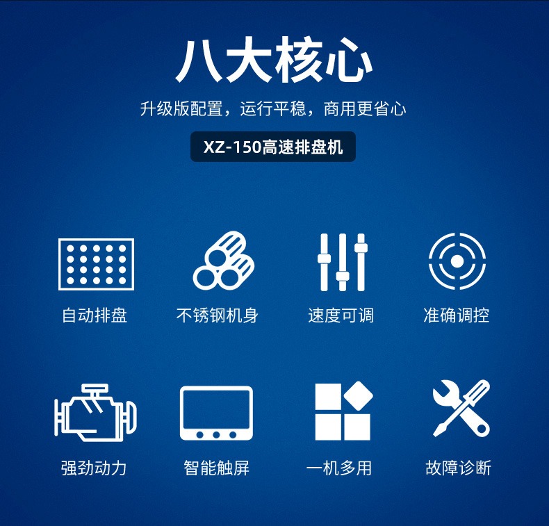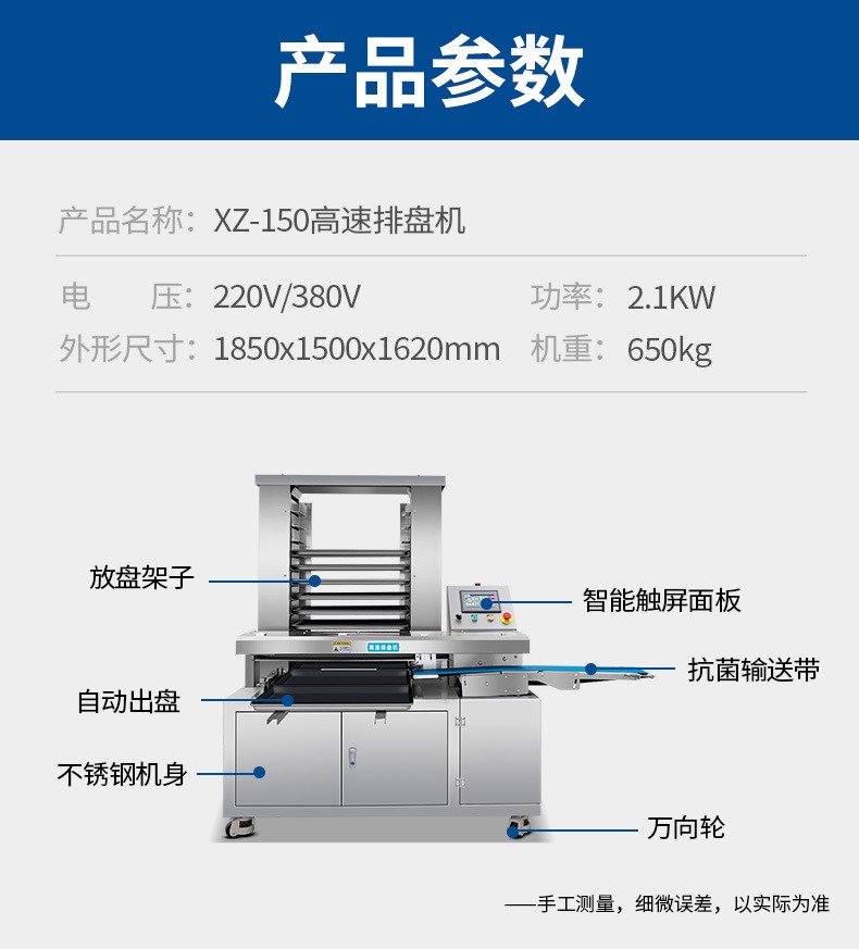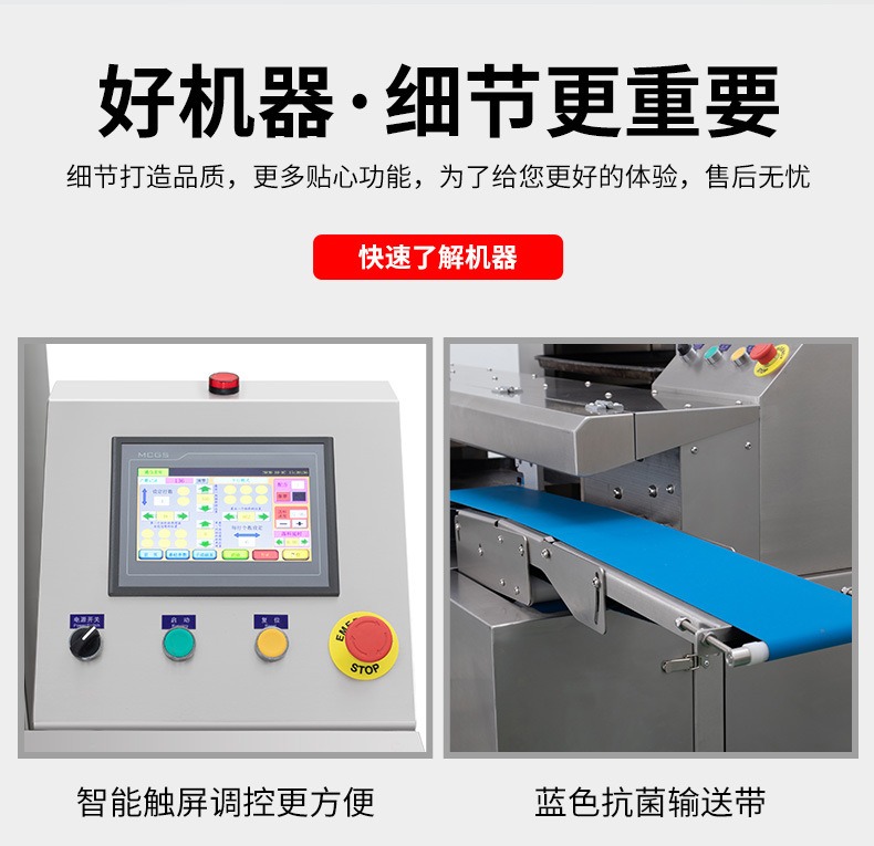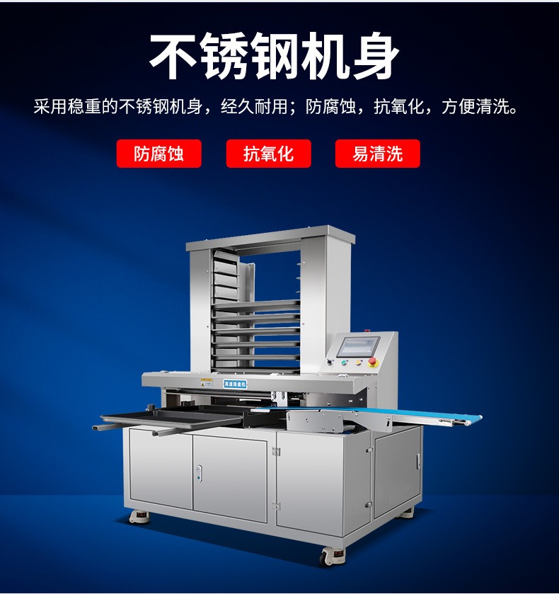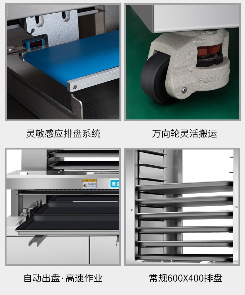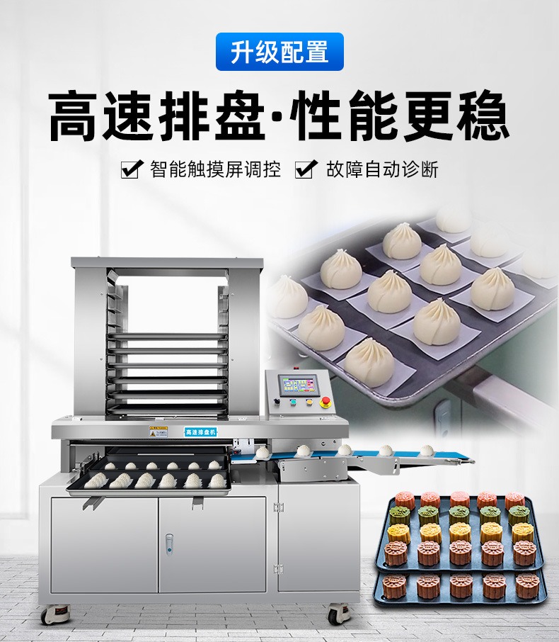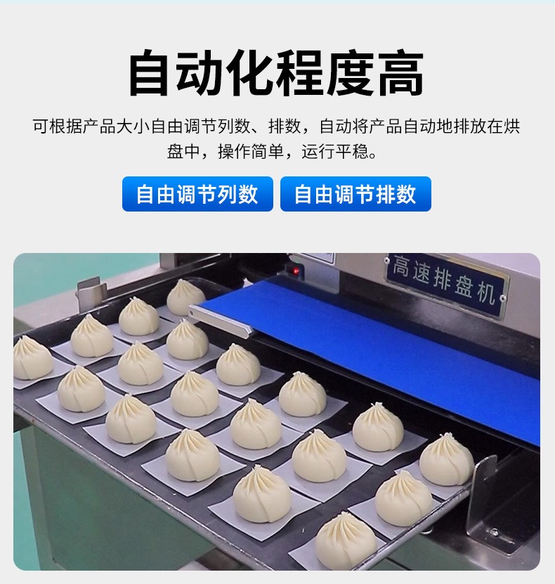 多功能商用高速排盤機(jī),自動化程度高,可根據(jù)產(chǎn)品大小自由調(diào)節(jié)列數(shù)、排數(shù),自動將產(chǎn)品自動地排放在烘盤中,操作簡單,運行平穩(wěn)。智能觸屏面板。控制系統(tǒng)由三菱PLC和進(jìn)口觸摸屏組成,操作簡單方便。具有故障自動診斷,一目了然。