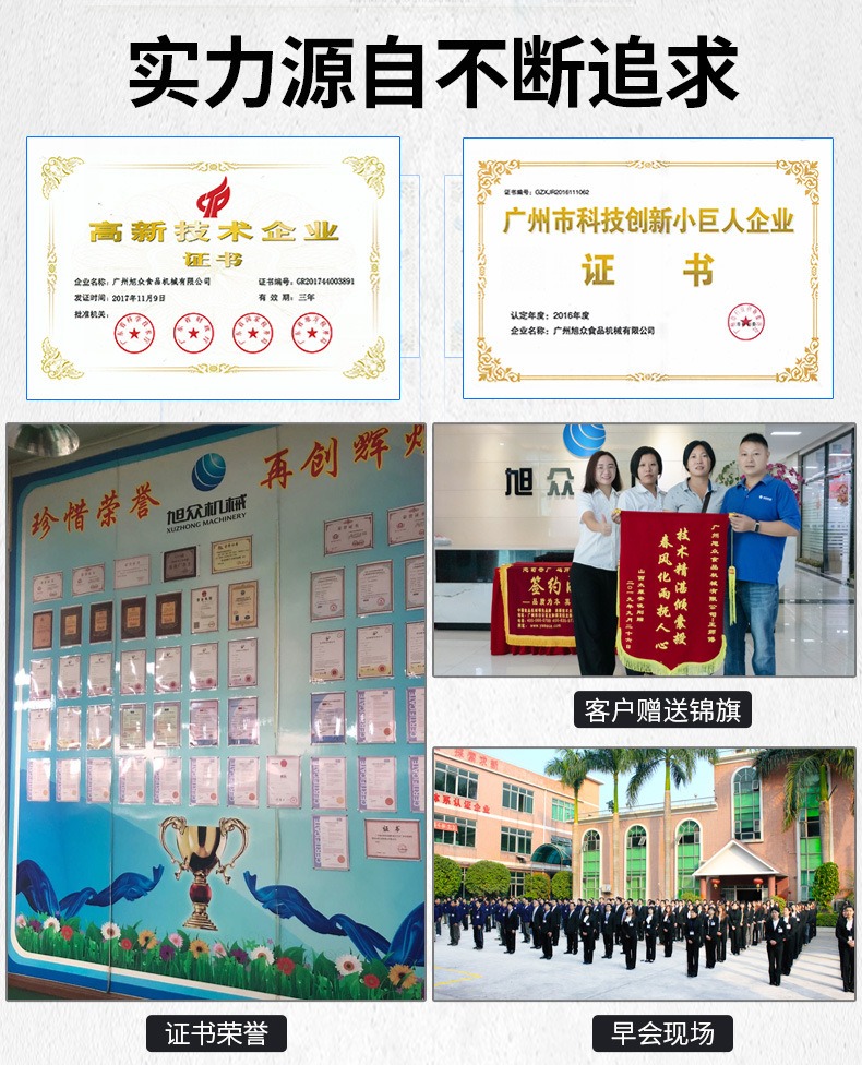 廣州旭眾食品機(jī)械有限公司是一家集科研開發(fā),生產(chǎn)設(shè)計,營銷服務(wù)為一體的現(xiàn)代化生產(chǎn)企業(yè)?,F(xiàn)代化生產(chǎn)車間,精湛制造技術(shù),所產(chǎn)機(jī)械歷經(jīng)市場重重考驗,不斷贏得海內(nèi)外客戶的贊譽。