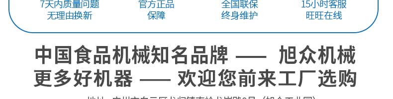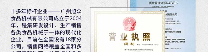 廣州旭眾食品機(jī)械有限公司是一家集科研開發(fā),生產(chǎn)設(shè)計(jì),營(yíng)銷服務(wù)為一體的現(xiàn)代化生產(chǎn)企業(yè)?,F(xiàn)代化生產(chǎn)車間,精湛制造技術(shù),所產(chǎn)機(jī)械歷經(jīng)市場(chǎng)重重考驗(yàn),不斷贏得海內(nèi)外客戶的贊譽(yù)。