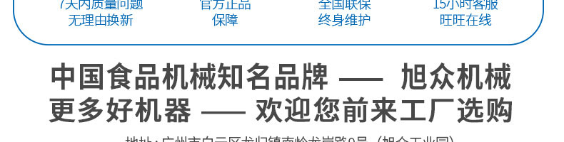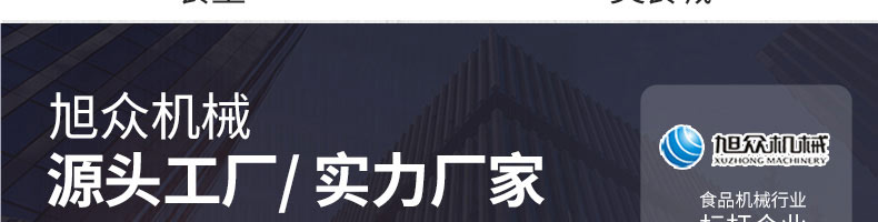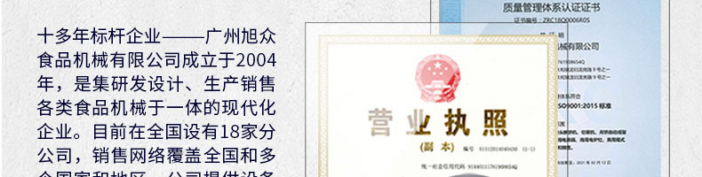 廣州旭眾食品機械有限公司是一家集科研開發(fā),生產(chǎn)設(shè)計,營銷服務(wù)為一體的現(xiàn)代化生產(chǎn)企業(yè)。現(xiàn)代化生產(chǎn)車間,精湛制造技術(shù),所產(chǎn)機械歷經(jīng)市場重重考驗,不斷贏得海內(nèi)外客戶的贊譽。