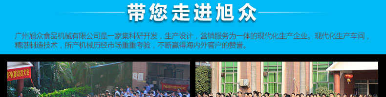廣州旭眾食品機(jī)械有限公司是一家集科研開發(fā),生產(chǎn)設(shè)計(jì),營銷服務(wù)為一體的現(xiàn)代化生產(chǎn)企業(yè)?,F(xiàn)代化生產(chǎn)車間,精湛制造技術(shù),所產(chǎn)機(jī)械歷經(jīng)市場重重考驗(yàn),不斷贏得海內(nèi)外客戶的贊譽(yù)。