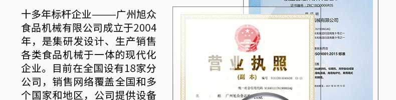 廣州旭眾食品機(jī)械有限公司是一家集科研開(kāi)發(fā),生產(chǎn)設(shè)計(jì),營(yíng)銷服務(wù)為一體的現(xiàn)代化生產(chǎn)企業(yè)?,F(xiàn)代化生產(chǎn)車間,精湛制造技術(shù),所產(chǎn)機(jī)械歷經(jīng)市場(chǎng)重重考驗(yàn),不斷贏得海內(nèi)外客戶的贊譽(yù)。