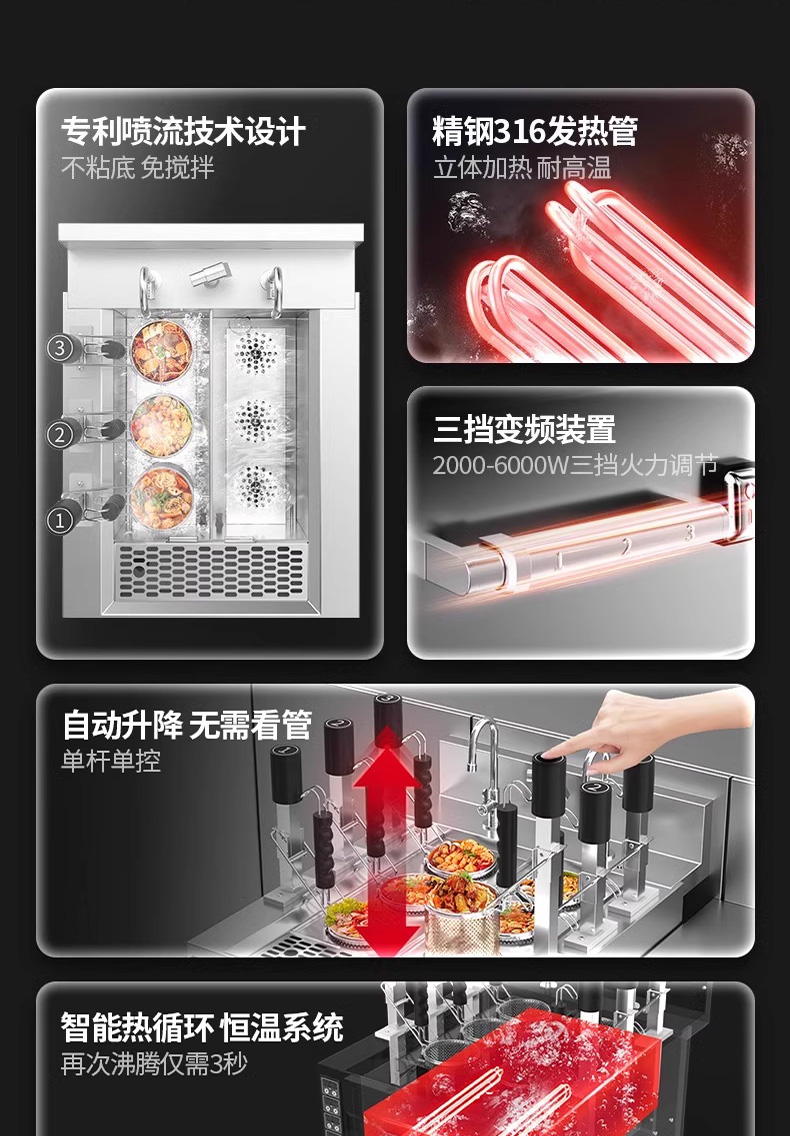 三合一煮面爐,全新升級,自動升降再次沸騰,僅需3秒。316精鋼加粗發(fā)熱管、升級噴流技術、低功耗變頻技術。煮面爐三合一升級,沸騰沖浪、變頻節(jié)能。