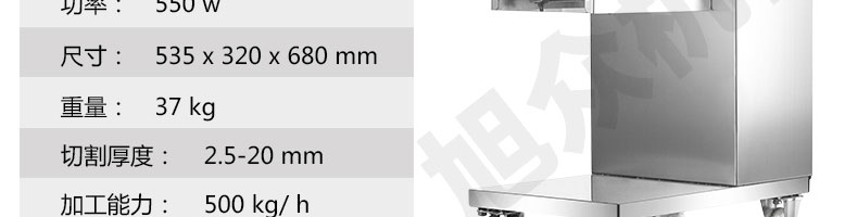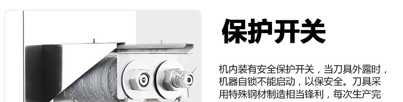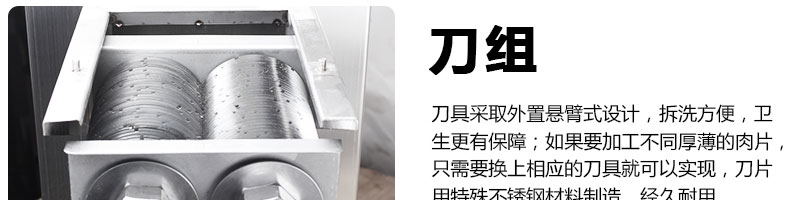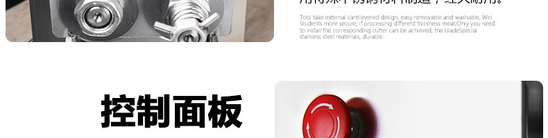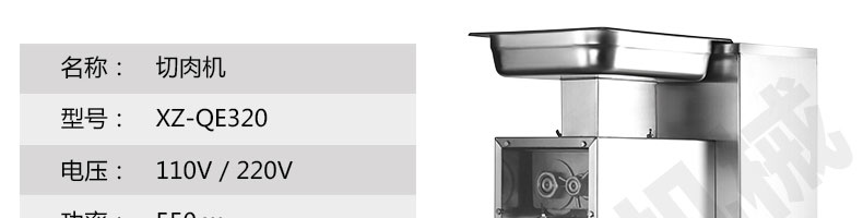 XZ-QE切肉機(jī),是一款可方便移動的肉類加工設(shè)備,配置單層刀具一次性切肉片,二次切肉絲,再切成粒。底座設(shè)置有滑輪,移動靈活,輕松便捷;刀具采取外置懸臂式設(shè)計,拆洗方便,衛(wèi)生更有保障;配置多種刀具,可加工不同厚度的肉片,實(shí)現(xiàn)一機(jī)多用;機(jī)內(nèi)裝有安全保護(hù)開頭,刀具外露時,機(jī)器自鎖不能啟動,以保安全;刀片用特殊不銹鋼材料制造,經(jīng)久耐用;卸下的刀具,不用清洗直接放置在6攝氏度以下的冰箱里,刀具余肉不發(fā)臭。