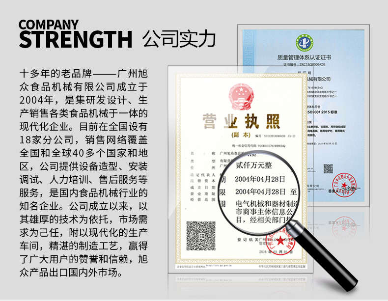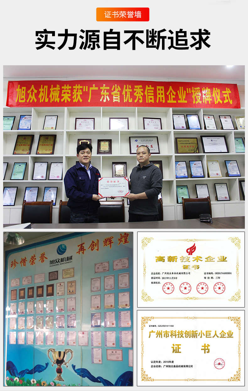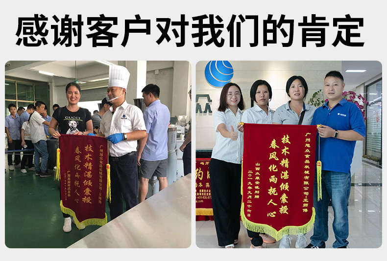 廣州旭眾食品機(jī)械有限公司是一家集科研開(kāi)發(fā),生產(chǎn)設(shè)計(jì),營(yíng)銷(xiāo)服務(wù)為一體的現(xiàn)代化生產(chǎn)企業(yè)。現(xiàn)代化生產(chǎn)車(chē)間,精湛制造技術(shù),所產(chǎn)機(jī)械歷經(jīng)市場(chǎng)重重考驗(yàn),不斷贏得海內(nèi)外客戶的贊譽(yù)。