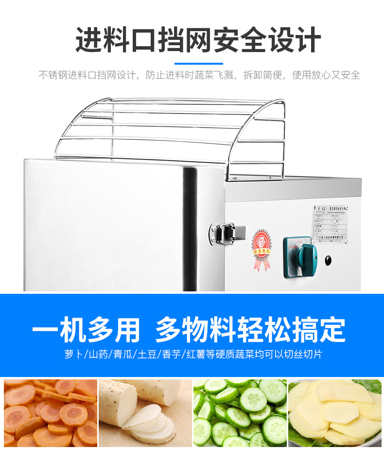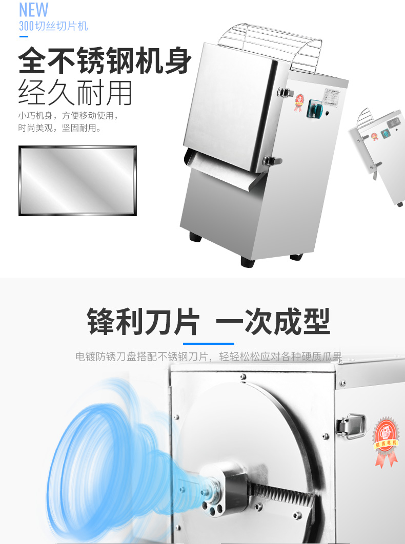 300型瓜果切絲切片機(jī),高效便捷、一次成型、每小時(shí)可切200-300KG。全不銹鋼機(jī)身經(jīng)久耐用小巧機(jī)身,方便移動(dòng)使用,時(shí)尚美觀,堅(jiān)固耐用。鋒利刀片、一次成型。電鍍防銹刀盤(pán)搭配不銹鋼刀片,輕輕松松應(yīng)對(duì)各種硬質(zhì)瓜果。