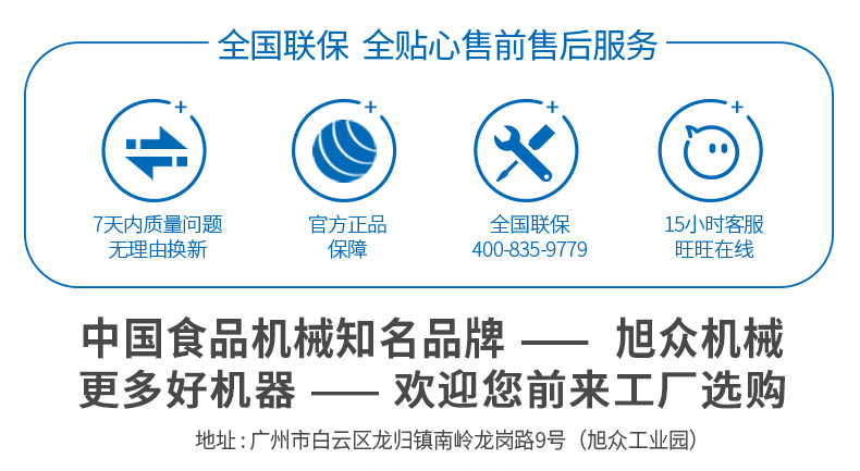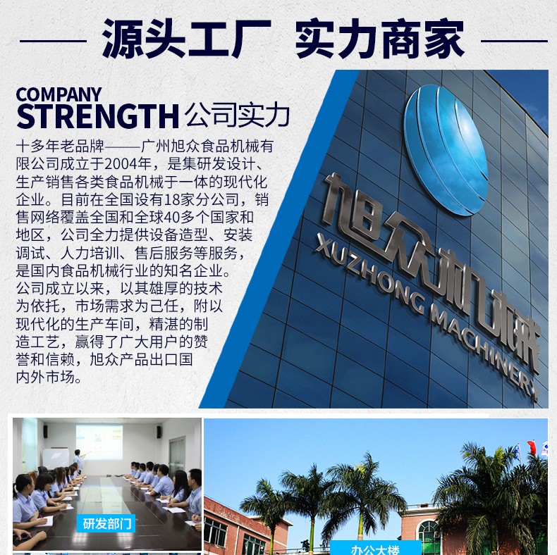 廣州旭眾食品機(jī)械有限公司是一家集科研開(kāi)發(fā),生產(chǎn)設(shè)計(jì),營(yíng)銷(xiāo)服務(wù)為一體的現(xiàn)代化生產(chǎn)企業(yè)。現(xiàn)代化生產(chǎn)車(chē)間,精湛制造技術(shù),所產(chǎn)機(jī)械歷經(jīng)市場(chǎng)重重考驗(yàn),不斷贏得海內(nèi)外客戶的贊譽(yù)。