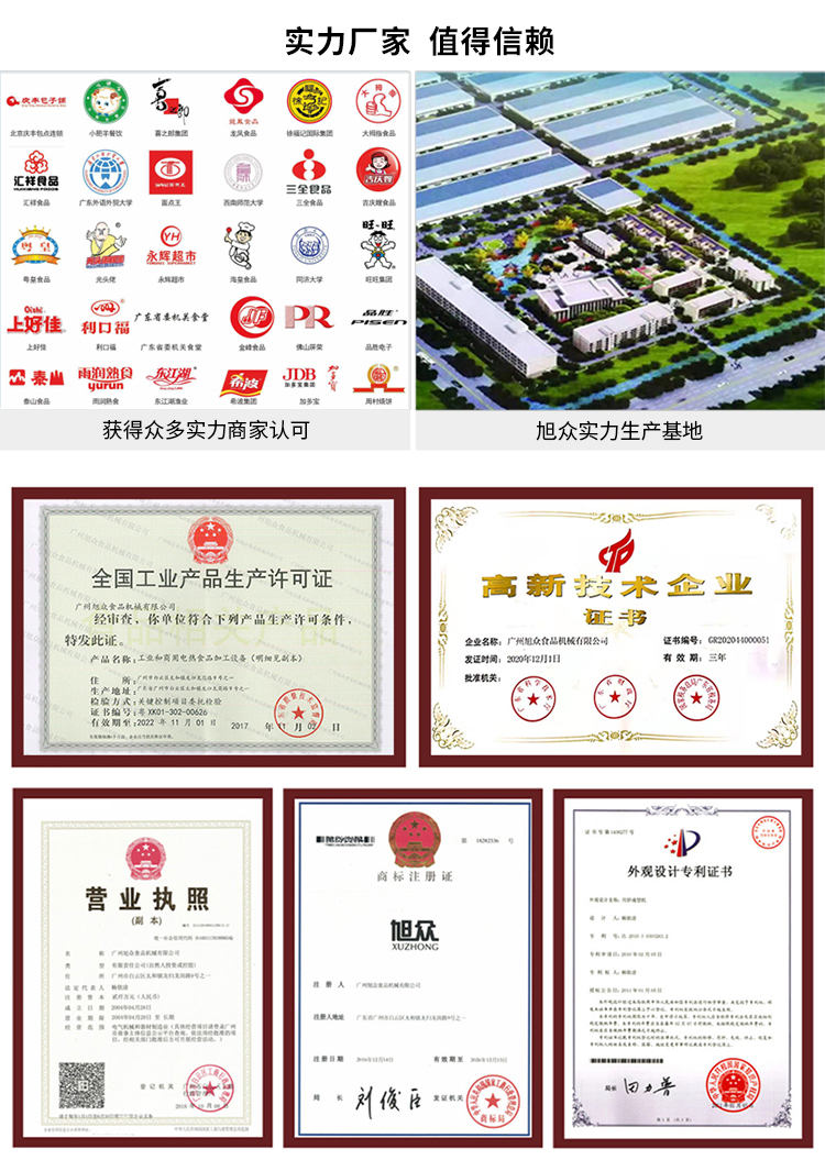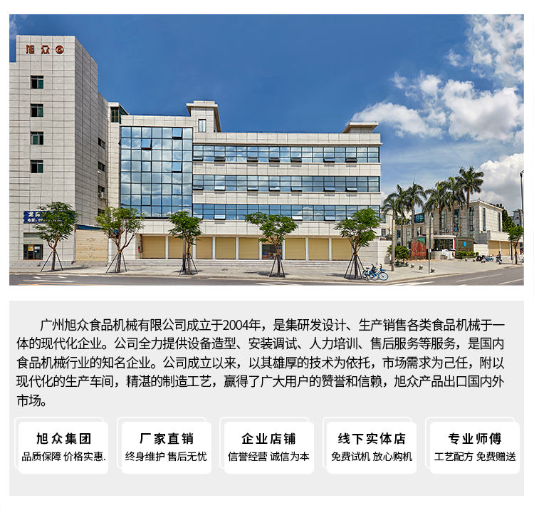 廣州旭眾食品機(jī)械有限公司是一家集科研開(kāi)發(fā),生產(chǎn)設(shè)計(jì),營(yíng)銷(xiāo)服務(wù)為一體的現(xiàn)代化生產(chǎn)企業(yè)?,F(xiàn)代化生產(chǎn)車(chē)間,精湛制造技術(shù),所產(chǎn)機(jī)械歷經(jīng)市場(chǎng)重重考驗(yàn),不斷贏得海內(nèi)外客戶(hù)的贊譽(yù)。