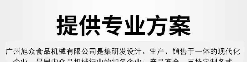 廣州旭眾食品機(jī)械有限公司是一家集科研開(kāi)發(fā),生產(chǎn)設(shè)計(jì),營(yíng)銷(xiāo)服務(wù)為一體的現(xiàn)代化生產(chǎn)企業(yè)?,F(xiàn)代化生產(chǎn)車(chē)間,精湛制造技術(shù),所產(chǎn)機(jī)械歷經(jīng)市場(chǎng)重重考驗(yàn),不斷贏得海內(nèi)外客戶的贊譽(yù)。