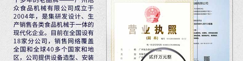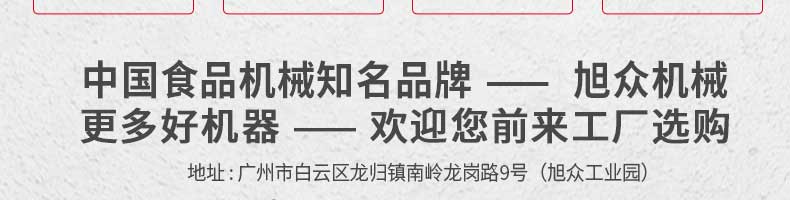廣州旭眾食品機(jī)械有限公司是一家集科研開發(fā),生產(chǎn)設(shè)計(jì),營銷服務(wù)為一體的現(xiàn)代化生產(chǎn)企業(yè)?,F(xiàn)代化生產(chǎn)車間,精湛制造技術(shù),所產(chǎn)機(jī)械歷經(jīng)市場重重考驗(yàn),不斷贏得海內(nèi)外客戶的贊譽(yù)。