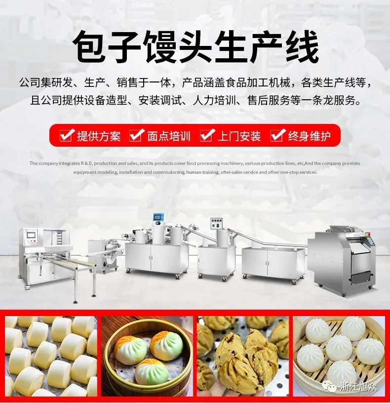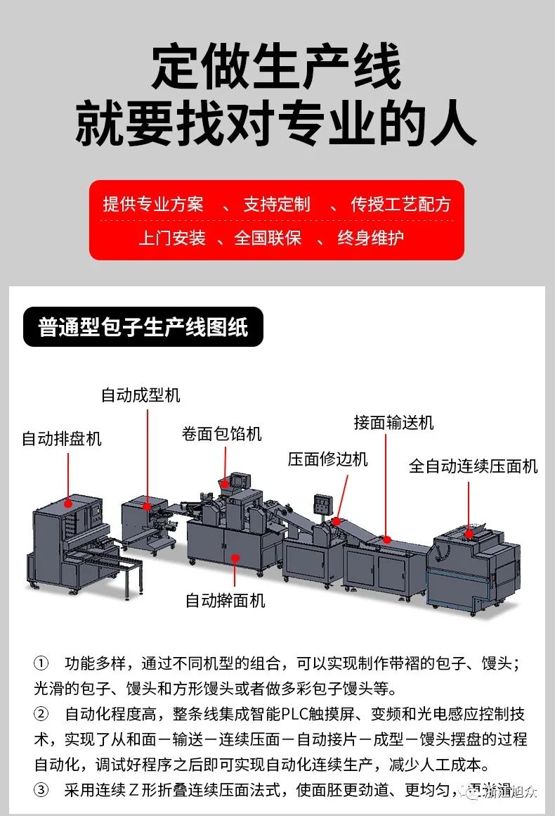 智能包子饅頭生產(chǎn)線,功能多樣,通過(guò)不同機(jī)型的組合,可以實(shí)現(xiàn)制作帶褶的包子、饅頭;光滑的包子、饅頭和方形饅頭或者做多彩包子饅頭等。