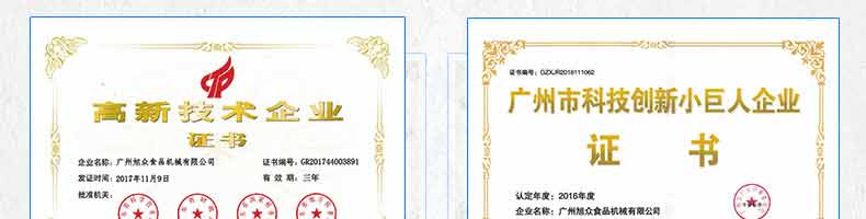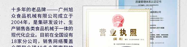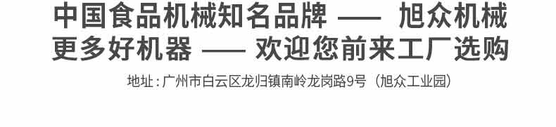 廣州旭眾食品機械有限公司是一家集科研開發(fā),生產(chǎn)設(shè)計,營銷服務(wù)為一體的現(xiàn)代化生產(chǎn)企業(yè)。現(xiàn)代化生產(chǎn)車間,精湛制造技術(shù),所產(chǎn)機械歷經(jīng)市場重重考驗,不斷贏得海內(nèi)外客戶的贊譽。
