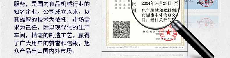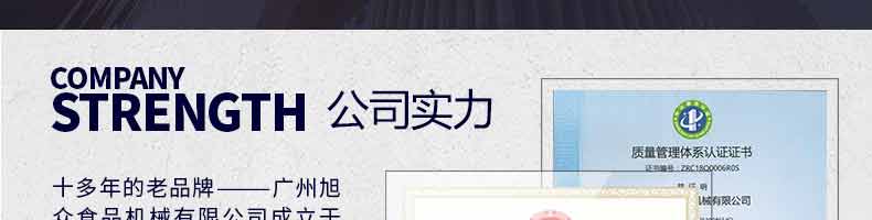廣州旭眾食品機械有限公司是一家集科研開發(fā),生產(chǎn)設計,營銷服務為一體的現(xiàn)代化生產(chǎn)企業(yè)?,F(xiàn)代化生產(chǎn)車間,精湛制造技術,所產(chǎn)機械歷經(jīng)市場重重考驗,不斷贏得海內(nèi)外客戶的贊譽。