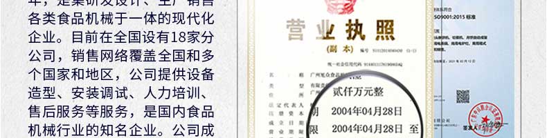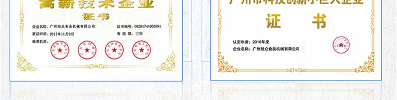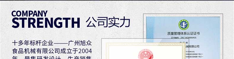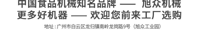 廣州旭眾食品機(jī)械有限公司是一家集科研開(kāi)發(fā),生產(chǎn)設(shè)計(jì),營(yíng)銷(xiāo)服務(wù)為一體的現(xiàn)代化生產(chǎn)企業(yè)?,F(xiàn)代化生產(chǎn)車(chē)間,精湛制造技術(shù),所產(chǎn)機(jī)械歷經(jīng)市場(chǎng)重重考驗(yàn),不斷贏得海內(nèi)外客戶的贊譽(yù)。