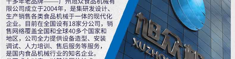 廣州旭眾食品機械有限公司是一家集科研開發(fā),生產設計,營銷服務為一體的現(xiàn)代化生產企業(yè)?,F(xiàn)代化生產車間,精湛制造技術,所產機械歷經市場重重考驗,不斷贏得海內外客戶的贊譽。
